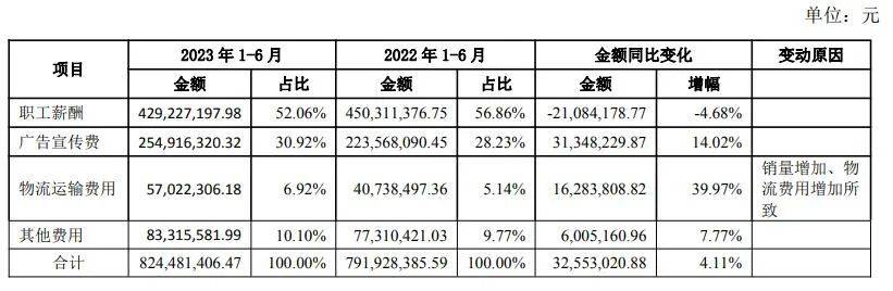 细分看,广告及市场费用是其大头。2023上半年,广告及市场费达5.69亿元,同比增长5.42%,占销售费比46.07%。