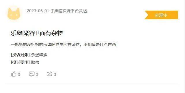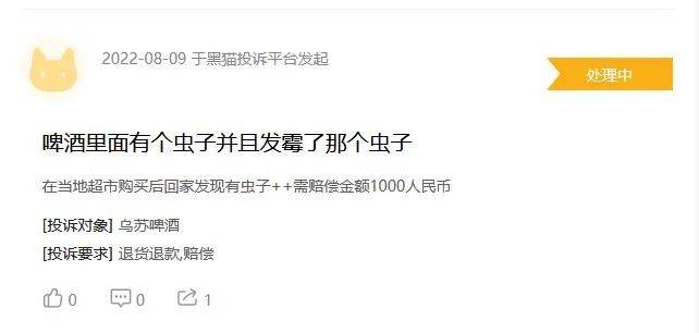 或许先把基础的品控风控做好,更急迫些。浏览黑猫投诉,一些旗下产品投诉值得警惕。2022年8月9日,有消费者称自己在当地超市购买的乌苏啤酒发现有虫子,向厂家提出赔偿1000元的要求。2023年6月1日,有消费者投诉一瓶新的没拆封的乐堡啤酒中有杂物。