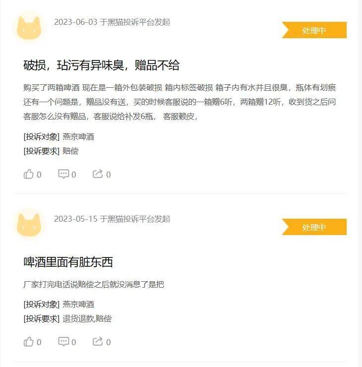 浏览黑猫投诉,一些用户投诉也应警惕。如2023年6月3日,有消费者投诉燕京啤酒,称购买两箱其中一箱外包装破损,箱子内有水且很臭,瓶体有划痕。2023年5月15日,有消费者投诉称,燕京啤酒里面有脏东西,厂家打完电话说赔偿后就没有消息了。