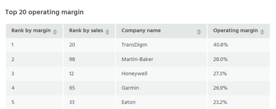 TransDigm营业利润率从前一年的35.2%增长为40.8%。另外,对于这个营业利润率排名,飞行国际表示百强中约三分之一的企业没有这方面的数据(或因未披露或因无法从公司总体营收中计算出航空业务)。
