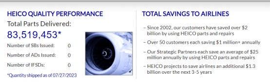 海科公司的主要业务之一,是售后市场中的航空替换件,主打的就是为客户省钱,其官网上介绍到HEICO零件和维修为客户节省超过20亿美元。