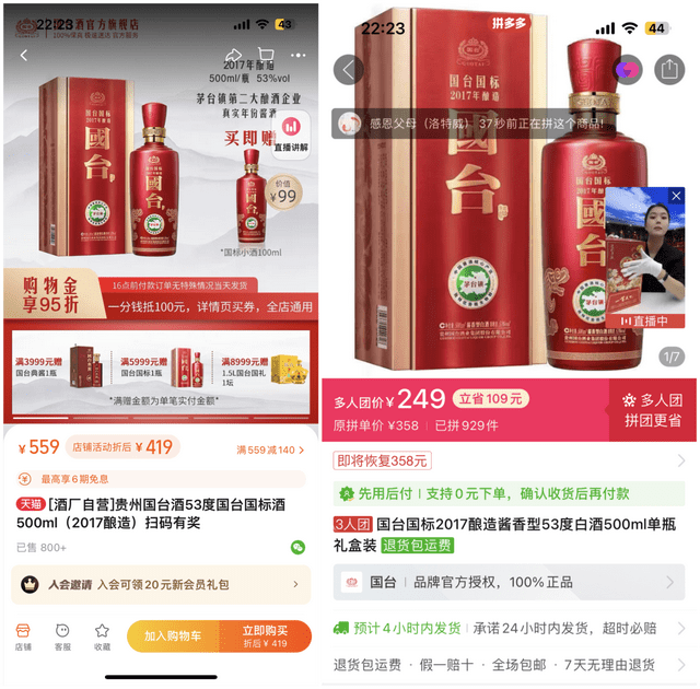 ▲不同电商平台的国台国标酒价格对比,图片来自天猫和拼多多