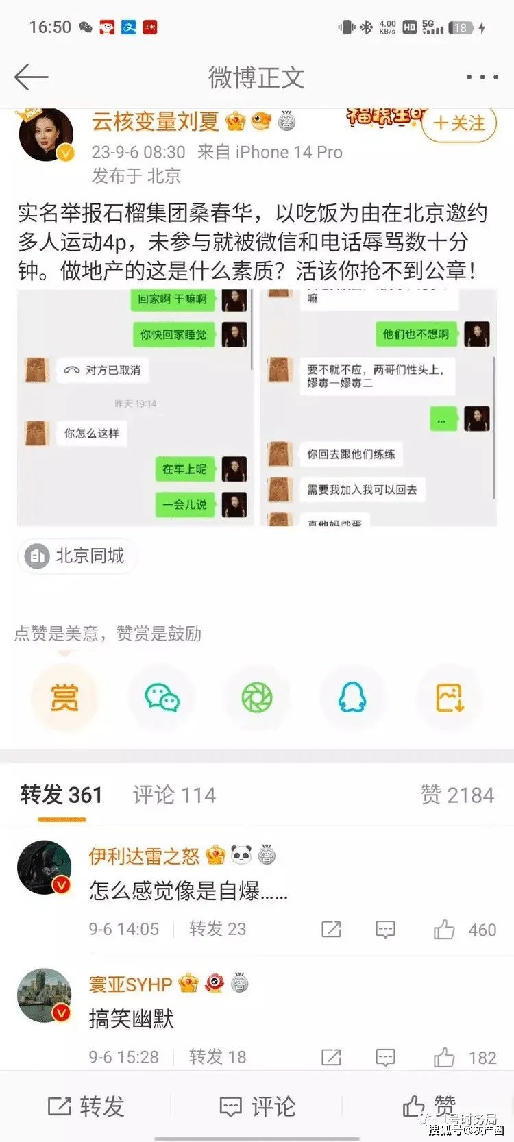 9月6日,云核变量集团CEO刘夏公开实名举报地产圈石榴集团桑春华,揭露其在微信上邀请4P“多人运动”的不良行径。