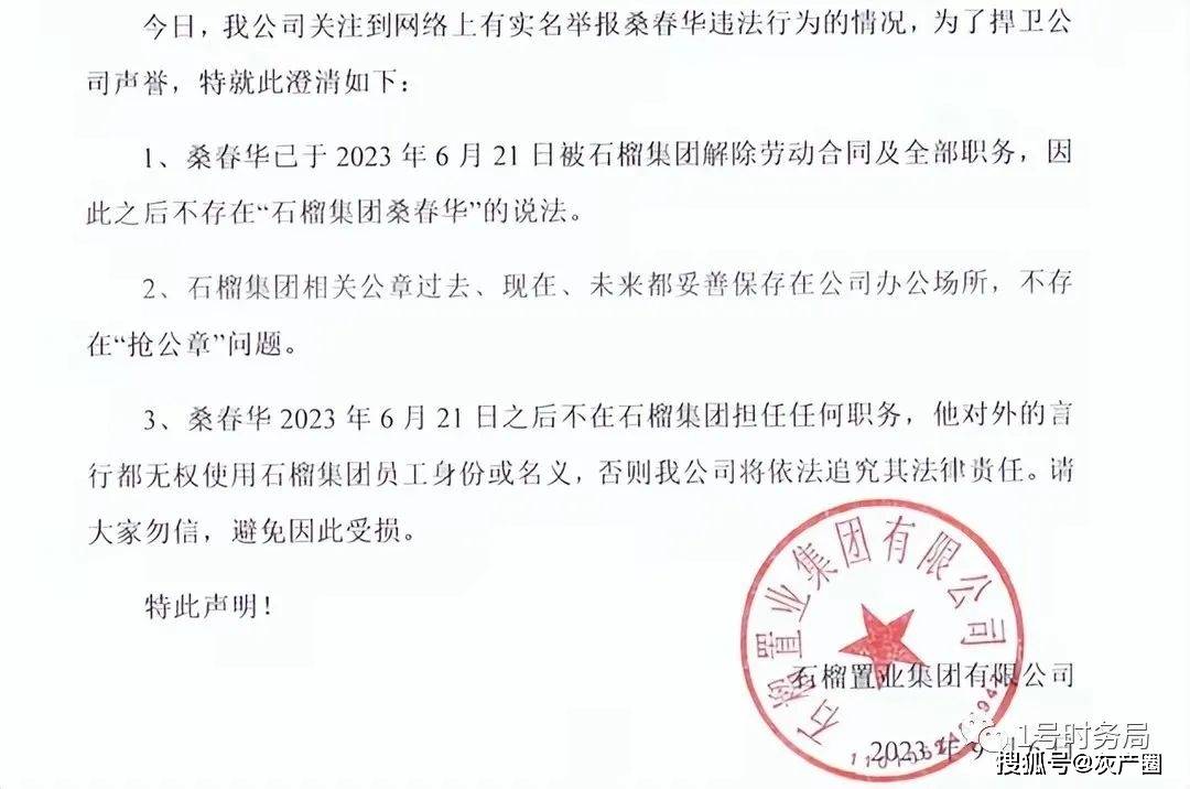 1. 桑春华已于2023年6月21日被石榴集团解除劳动合同及全部职务,因此之后不存在“石榴集团桑春华”的说法。