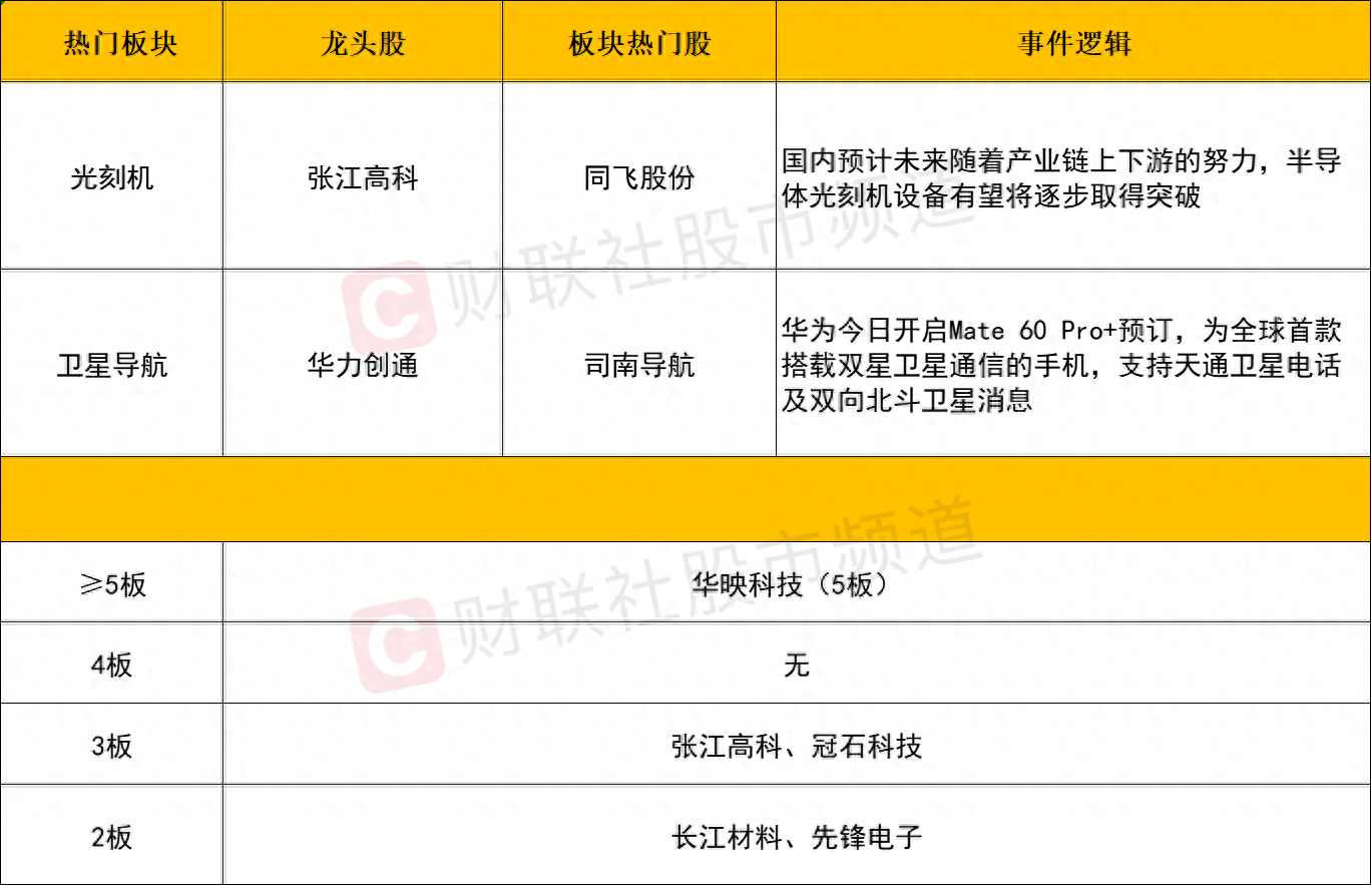 板块上,卫星导航板块涨幅居前,震有科技、华力创通、司南导航大涨20%,海格通信、中国卫通、高斯贝尔涨停,航宇微、四川九洲、金信诺等个股同样涨幅居前。消息面上,华为今日开启Mate 60 Pro+预订,为全球首款搭载双星卫星通信的手机,支持天通卫星电话及双向北斗卫星消息。