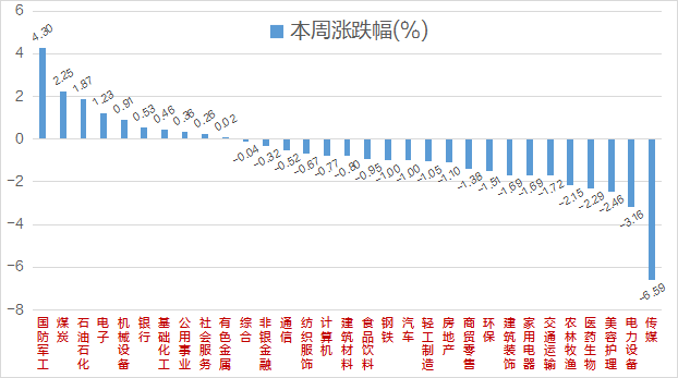全周维度来看,申万31个一级行业跌多涨少,国防军工板块收获4.3%的涨幅领跑,煤炭行业本周继续上涨,涨幅超过2%,石油行业、电子行业涨超1%;传媒行业大跌,跌约6.6%,电力行业跌超3%,美容护理、医药生物、农林牧渔等跌超2%。