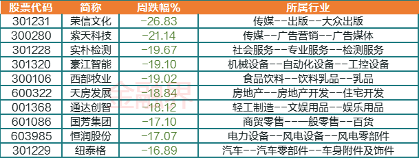 熊股方面,阶段性上涨后迎来限售股解禁,叠加文化传媒板块的调整,荣信文化本周跌26.83%成为第一熊股,同为传媒股的紫天科技跌21.14%;核污染概念股实朴检测跌19.67%;次新股豪江智能跌19.1%,通达创智跌18.12%;食品饮料板块的西部牧业累跌19.02%,该股上一周累涨近3成;地产股京投发展跌18.84%;零售板块的国芳集团跌17.1%;风电板块的恒润股份同样跌超17%,此前6月到8月该股累计涨幅接近50%;汽车零部件板块的纽泰格跌近17%排在十大牛股第10名的位置。