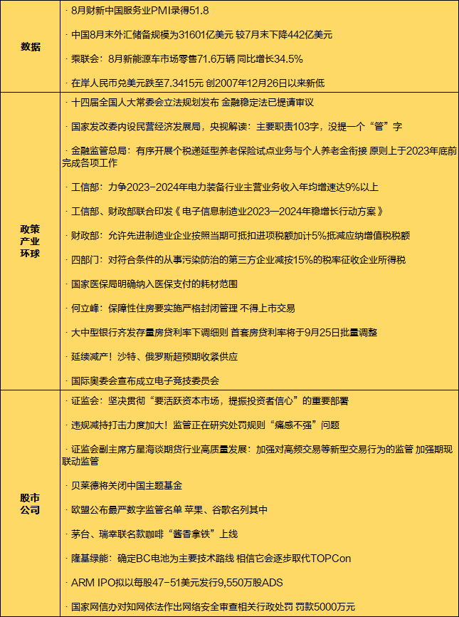本周A股缩量调整,沪指周跌0.53%,创业板指累跌逾2%。华为新机备受瞩目,在A股市场也掀起了一波炒作狂潮,华为产业链、卫星通信、星闪概念、光刻胶、光刻胶等题材纷纷爆发;截至目前A股共120家千亿市值公司,宁德时代市值一周蒸发近600亿元;本周4只新股上市,1只首日涨幅超过200%。北向资金大比例增减仓个股以及机构调研股也浮出水平面。