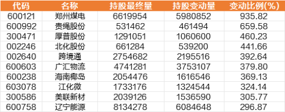 个股变动方面,截至8月24日的近5个交易日数据显示,北向资金大比例加仓个股名单中,变动比例最高的是郑州煤电,变动比例高达935.82%,贵绳股份的变动比例也相对较高,厚普股份、渤海股份、跨境通、广汇物流、海南椰岛、江化微等增持变动比例靠前。