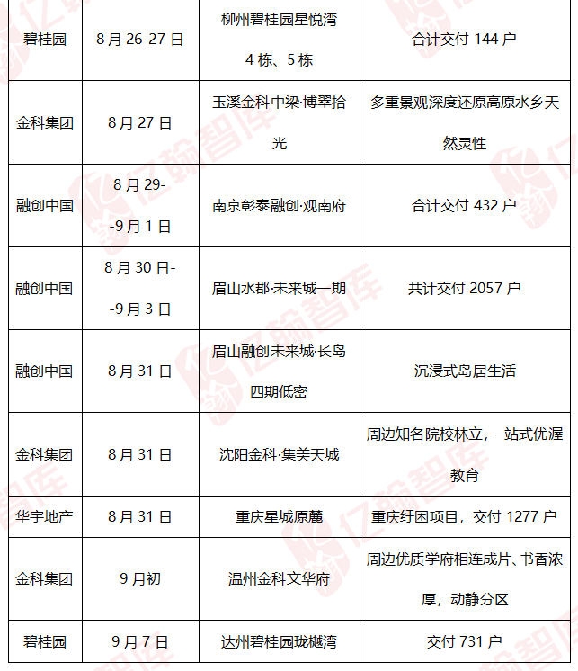 近期企业发布数个项目交付,分布在沈阳、湖州、福州、柳州、眉山等城市;其中,融创中国成功交付五个项目,金科集团成功交付四个项目,碧桂园成功交付三个项目,绿城中国与华宇地产分别成功交付一个项目。