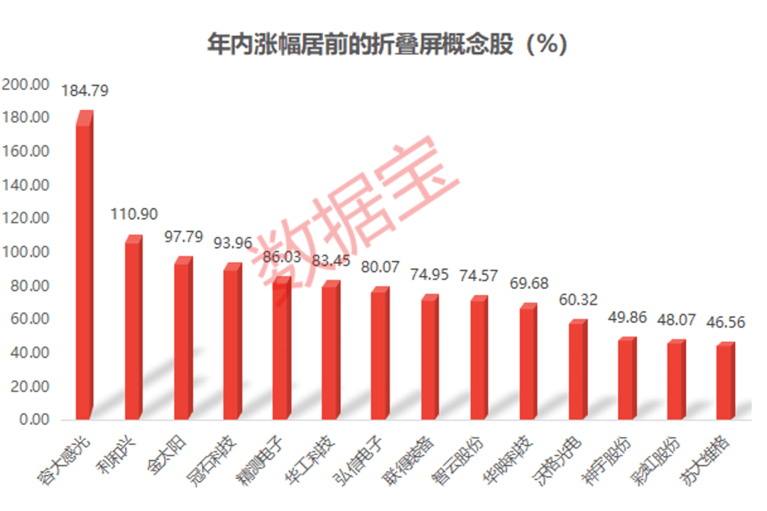 数据宝统计,今年以来,折叠屏板块中,容大感光、利和兴、金太阳、冠石科技、精测电子等个股涨幅居前,其中容大感光涨幅超180%。