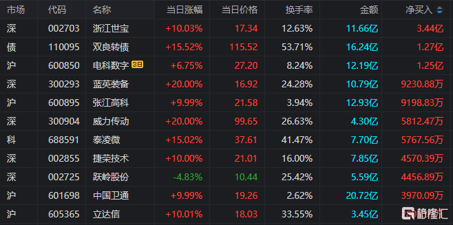 今日龙虎榜净买入额前三为浙江世宝、双良转债、蓝英装备,分别为3.44亿元、1.27亿元、9230.88万元。