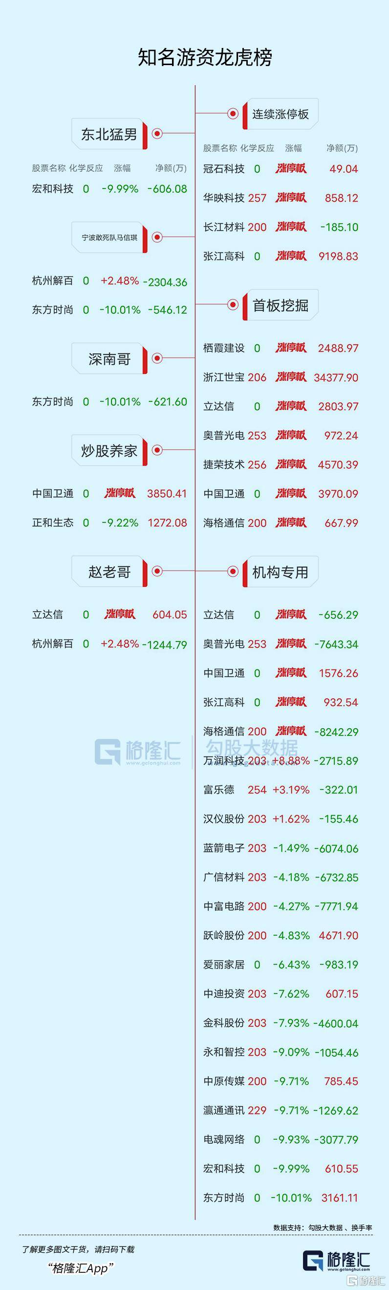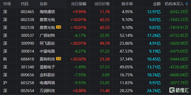 龙虎榜中涉及机构专用席位的个股中,当日净卖出额前三的是海格通信、奥光电、广信材料,分别为8242.29万元、7643.33万元、6732.85万元。