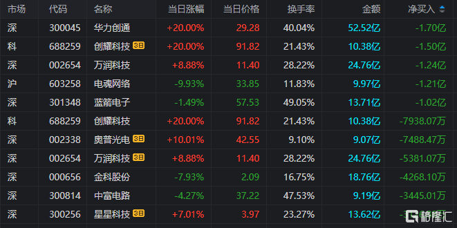 龙虎榜净卖出额前三为华力创通、万润科技、电魂网络,分别为1.70亿元、1.24亿元、1.21亿元。