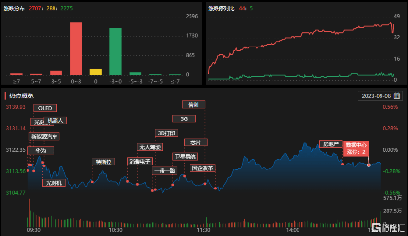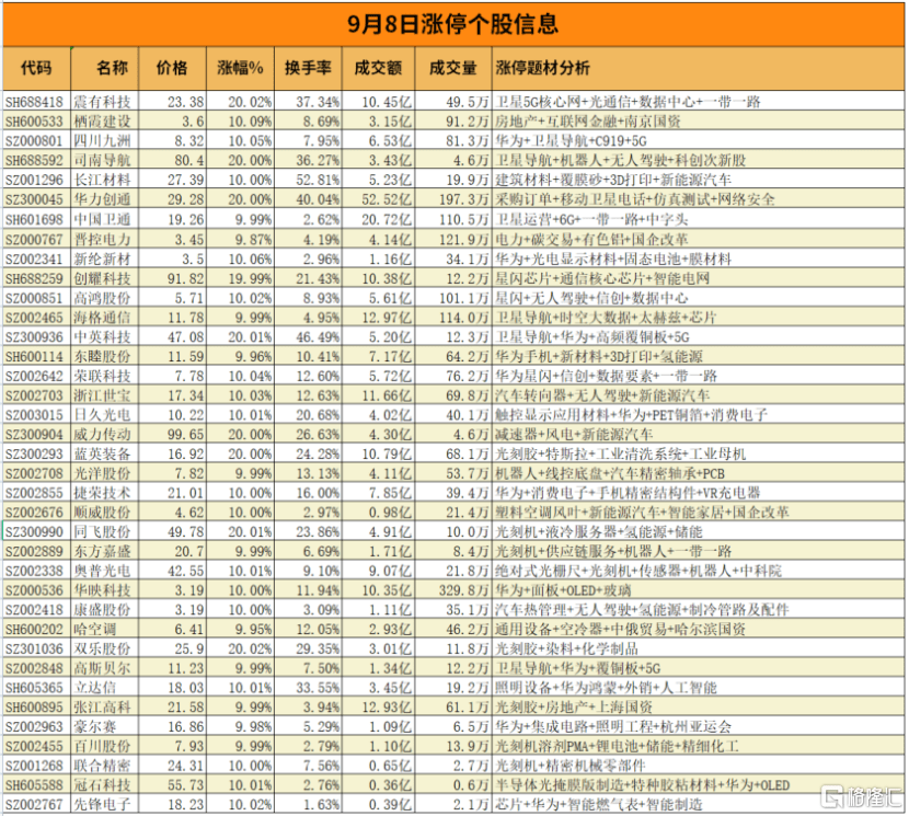 9月8日,总体上个股涨多跌少,两市超2700只个股上涨。沪深两市今日成交额6818亿,较上个交易日缩量850亿,成交金额自8月22日以来再度跌破7000亿。