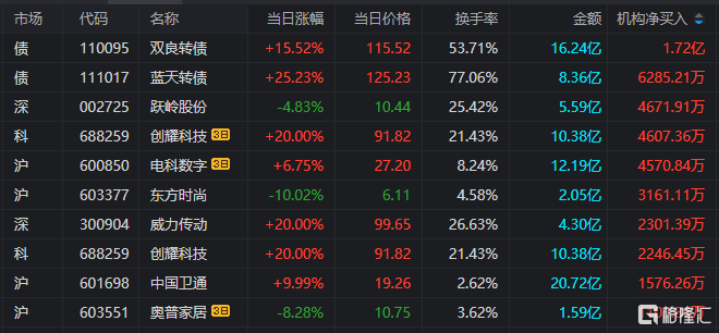 龙虎榜中涉及机构专用席位的个股中,当日净买入额前三的是双良转债、蓝天转债、跃岭股份,分别为1.72亿元、6285.21万元、4671.91万元。