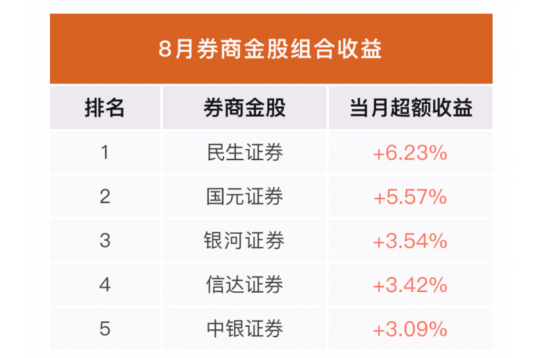 从8月金股组合的表现来看,收益率排名前五的组合分别属于民生证券、国元证券、银河证券、信达证券和中银证券,民生证券以当月+6.23%的超额收益斩获榜单第一,国元证券和银河证券月度金股则分别以+5.57%和+3.54%的收益率进入榜单前三。