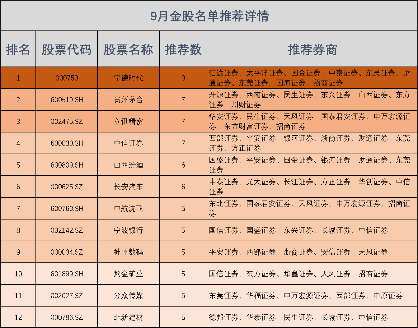 在各大券商研究所公布的金股名单中,宁德时代(300750.SZ)超越8月的冠军金股长安汽车(000625.SZ)成为9月最热门金股,并同时获得9家券商推荐,分别是信达证券、太平洋证券、国金证券、中泰证券、东吴证券、财通证券、东莞证券、国海证券和招商证券。