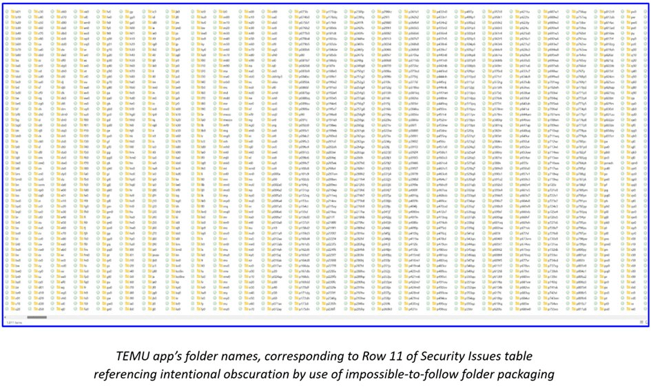 接着贴出一张众多文件夹的图,称这是Temu为了隐藏该软件的恶意和入侵行为,拼多多做了巨大的努力。