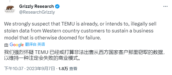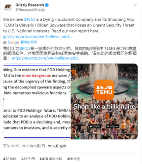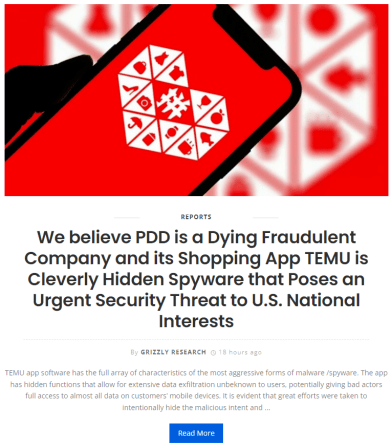 Grizzly Research的报告标题是“我们认为拼多多是一家垂死的欺诈公司,其购物应用程序 TEMU 是巧妙隐藏的间谍软件,对美国国家利益构成紧急安全威胁。”