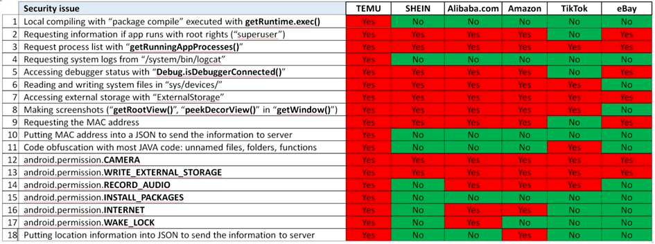 TEMU应用程序软件具有最具攻击性的恶意软件/间谍软件的全部特征。并附加了一张图指控拼多多犯了所有“间谍特征”,图中还包含了SHEIN、阿里、Amazon、Tik Tok、eBay。