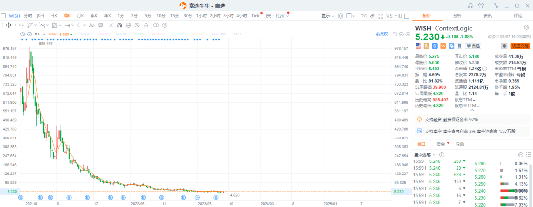 灰熊所说的wish连连网,在temu出现前,被称为“美版拼多多”,因为上面95%的卖家都来源于中国,同样是中国供应链输出海外。在2021年时,wish的股价最高时为985元,而现在仅剩5.23元。