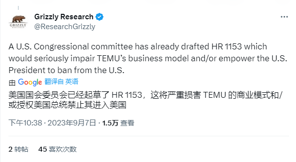 在这份报告的结尾,灰熊机构说出了报告的重点:美国国会已经起草了编号HR1153,这将严重损害TEMU的商业模式和或授权美国总统禁止Temu进入美国。