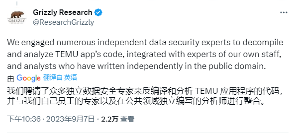 2、灰熊机构称,找了很多数据安全专家来分析Temu的代码,并于我们自己的专家以及在公共领域独立编写的分析师进行整合。