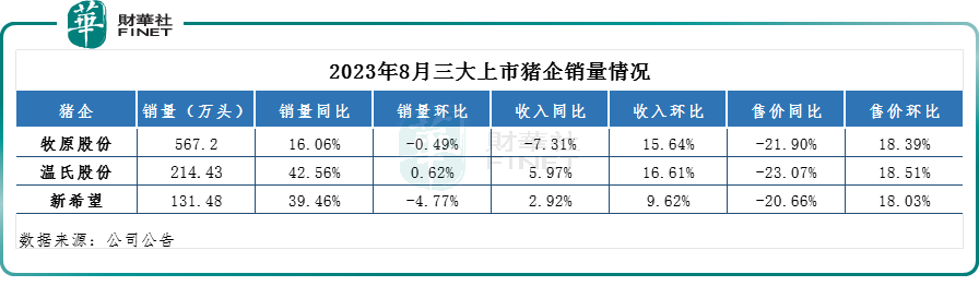 数据披露显示,随着产能逐步释放,牧原股份(002714.SZ)、温氏股份(300498.SZ)、新希望(000876.SZ)等头部上市猪企的生猪销量同比均呈现回升的态势;同时,又由于8月生猪价格有所冲高,上述猪企销售收入环比均有不同程度的上涨。