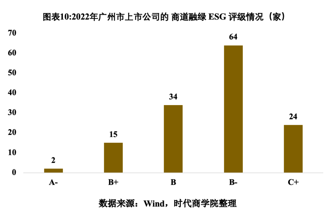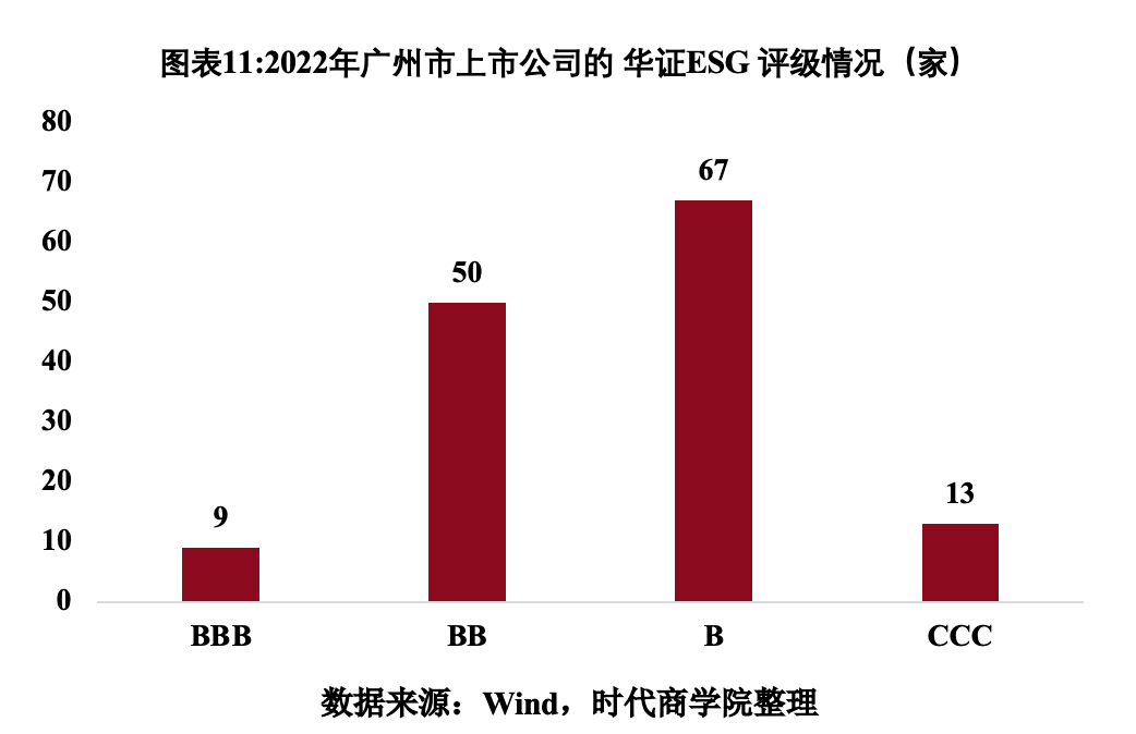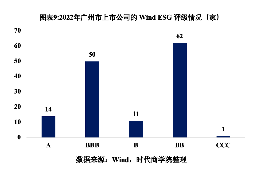 从广州市上市公司的Wind-ESG评级看,如图表9所示,截至2022年末,在2022年度接受了“Wind-ESG评级”的广州市138家企业中,没有上市公司处于领先水平(AA级及以上),有64家企业评级为“A”或“BBB”,处于良好水平(A级或BBB级),占比为46.38%;另有74家A股上市公司处于待提升阶段(BB级及以下),占比为53.62%。可见,广州市上市企业的ESG发展并不充分,企业多数处于良好或待提升阶段。