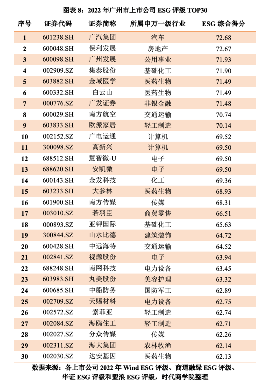 因此,时代商学院在Wind-ESG评级、商道融绿ESG评级、华证ESG评级和盟浪ESG评级共四个本土评级体系的基础上,对广州上市企业的ESG评级进行综合评估,得出广州市上市公司ESG评级前30榜单,如图表8所示。