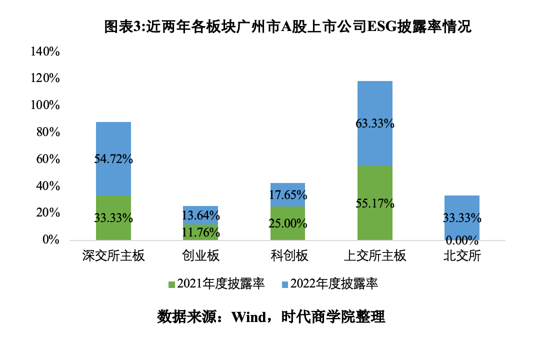 如图表3所示,据Wind数据,截至2023年6月30日,广州市合计有150家上市公司,其中,来自上交所主板的广州上市企业共有30家,披露率为63.33%;来自深交所主板的广州市上市企业共有53家,披露率为54.72%;来自深交所创业板的广州市上市企业共有44家,披露率为13.64%;来自上交所科创板的广州市上市企业共有17家,披露率为17.65%;来自北交所的广州市上市企业共有6家,披露率为33.33%。