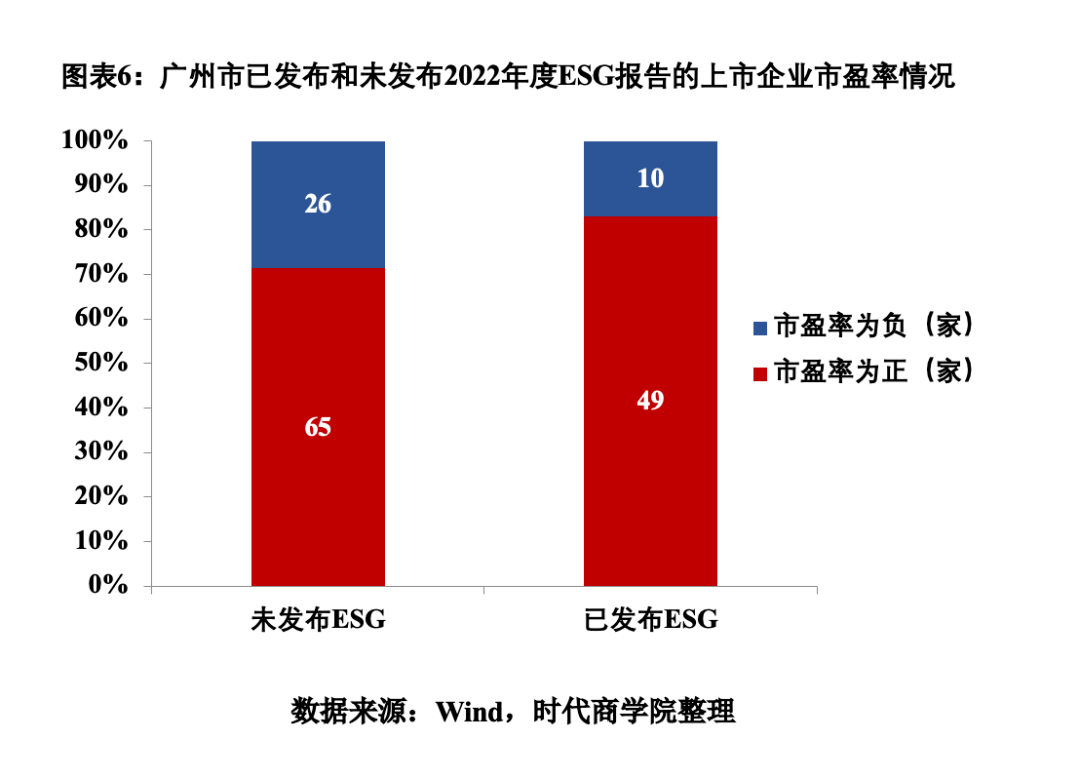 从市盈率看,如图表6所示,截至2023年6月30日,在广州市91家未发布2022年度ESG报告的上市公司中,有26家企业的市盈率为负值,占比为28.57%;而在广州市59家发布了2022年度ESG报告的上市企业中,仅有10家企业的市盈率为负值,占比为16.95%。