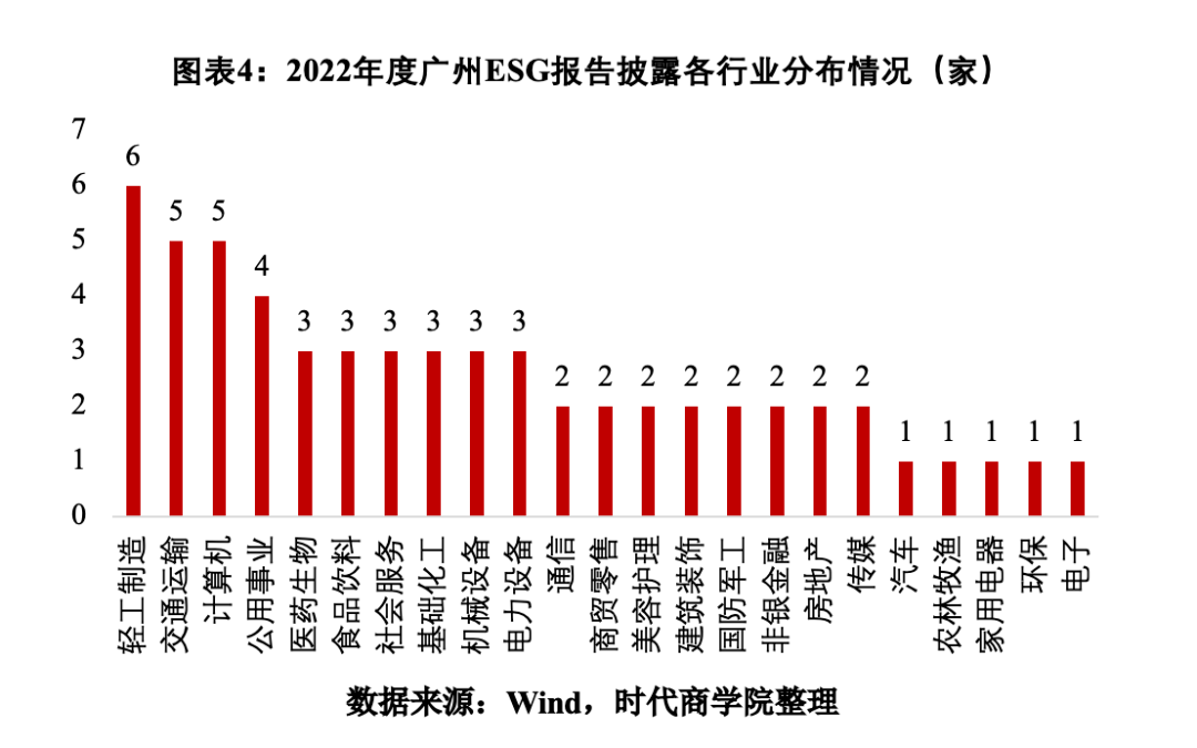 具体来看,如图表4所示,截至2023年6月30日,广州市59家发布2022年度ESG报告的上市企业分布于23个行业,其中,轻工制造行业披露2022年度ESG报告的企业数量最多,为6家,占比为10.17%;交通运输、计算机行业分别以5家的企业数量并列第二。