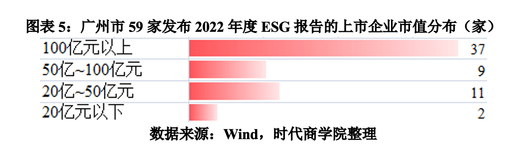 另外,如图表5所示,在广州市59家发布2022年度ESG报告的上市企业中,百亿市值及以上的企业有37家,占比为62.71%。