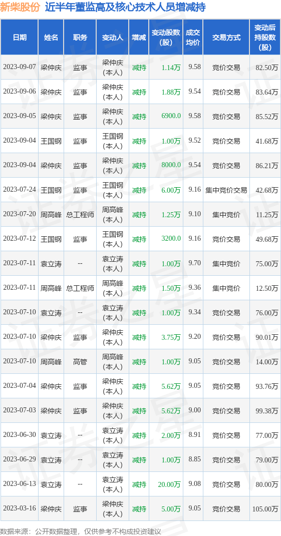 新柴股份近半年内的董监高及核心技术人员增减持详情如下: