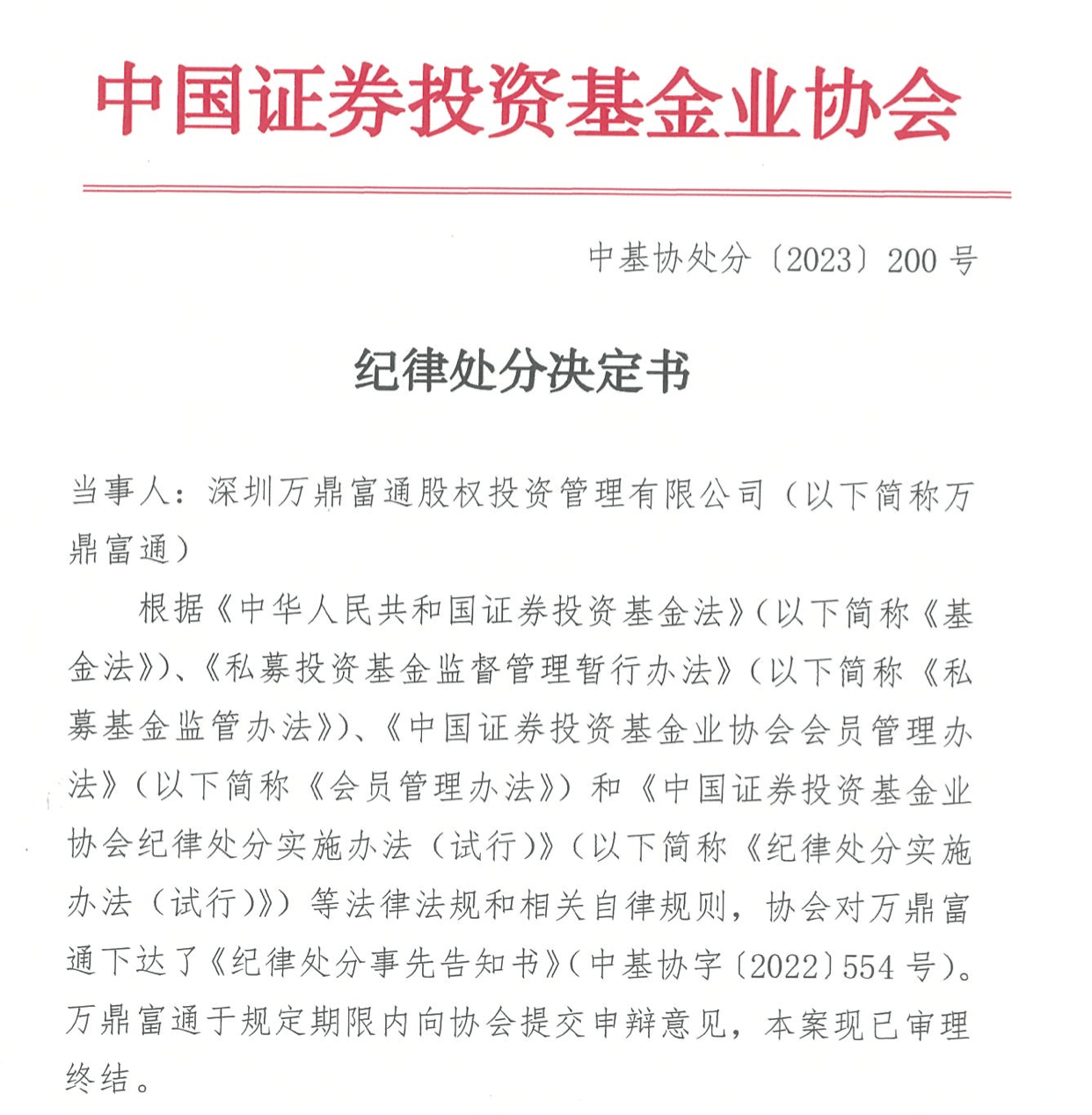 9月8日,中基协纪律处分决定书显示,深圳万鼎富通股权投资管理有限公司(下称“深圳万鼎富通”)存在未履行勤勉尽责义务、从事资金池业务、未及时向协会更新报送相关信息等违规行为。对此,中国证券投资基金业协会作出取消会员资格、撤销管理人登记的纪律处分。