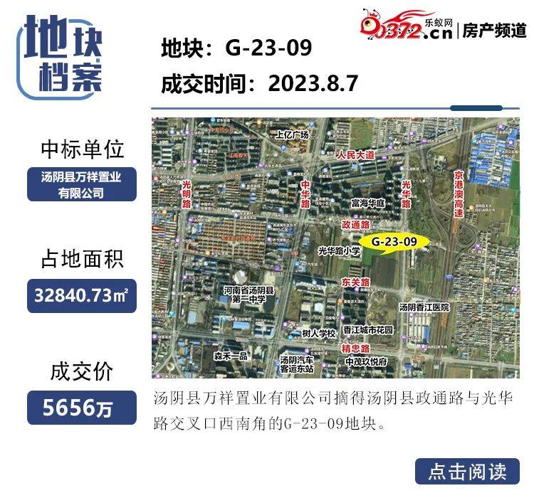 8月7日,G-23-09地块由汤阴县万祥置业有限公司以5656万元摘得,每亩约114.82万元,位于汤阴县政通路与光华路交叉口西南角,出让面积49.2611亩,土地用途为住宅兼容商用。