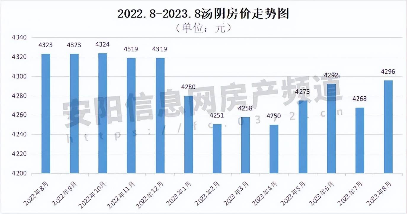 根据安阳信息网汤阴楼市不完全统计,2023年8月汤阴住宅均价为4296元/㎡,较上个月上涨28元/㎡,较去年同期下降0.6%。房价变动的原因之一是永硕·文博書院自取得预售证后,首次释放价格,均价5200元/㎡。