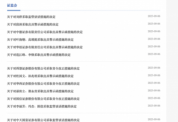 9月8日,证监会官网一次性释出13张针对券商投行业务的罚单,涉及华西证券、西部证券、华创证券、中德证券、中天国富证券、国信证券等6家券商,13名相关高管。