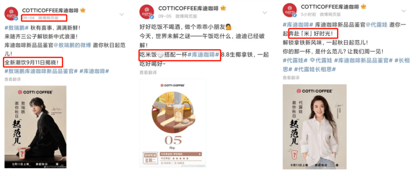 在营销上,库迪也始终对标瑞幸。从代言人到新品品鉴/分享官(仅为指定产品做宣传)皆采取“紧跟”策略。