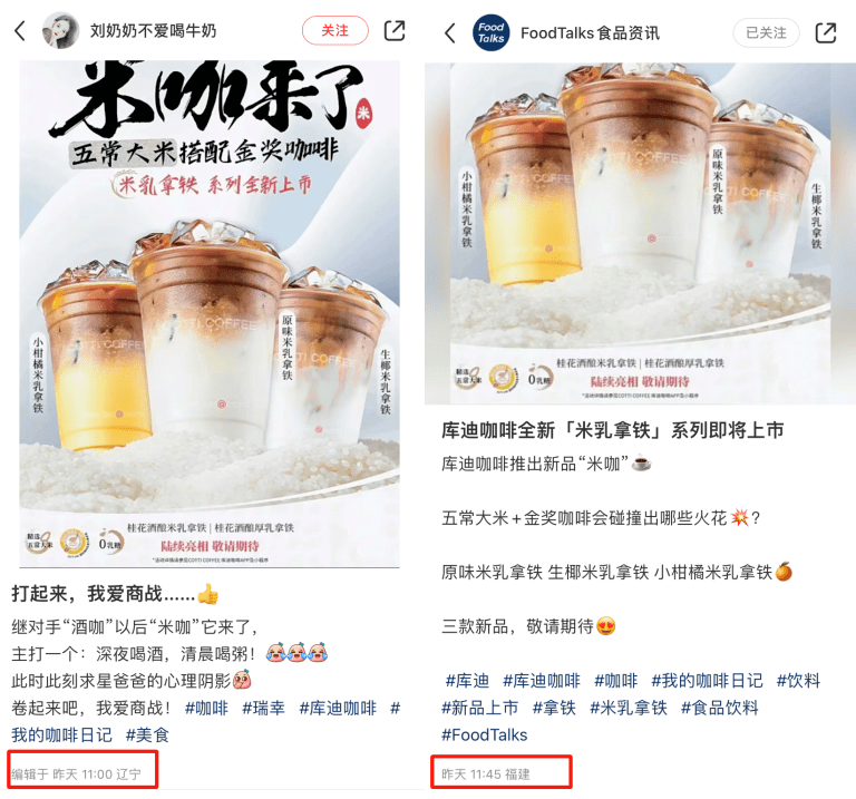 笔者以#库迪咖啡米咖#、#库迪咖啡 五常大米#为关键词在小红书上搜索发现,一位名为@刘奶奶不爱喝牛奶的用户于7日中午11时发布了库迪新品米咖的相关信息,随后行业新媒体跟进并发布相关资讯。