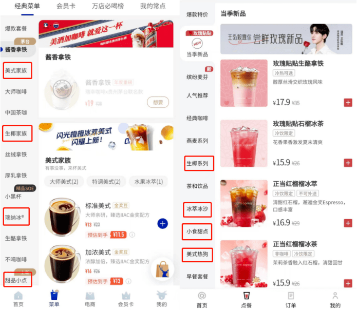 产品方面,库迪与瑞幸的品类结构较为相似,例如瑞幸的爆品生椰系列、瑞纳冰系列,库迪也有。