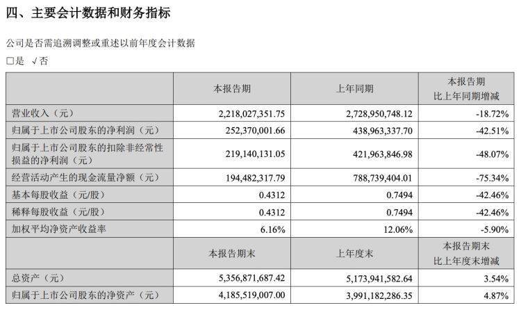 据四川美丰2023年半年报,上半年公司实现营业收入22.18亿元,同比下降18.72%;实现归属于上市公司股东的净利润2.52亿元,同比下降42.51%;实现基本每股收益0.4312元。