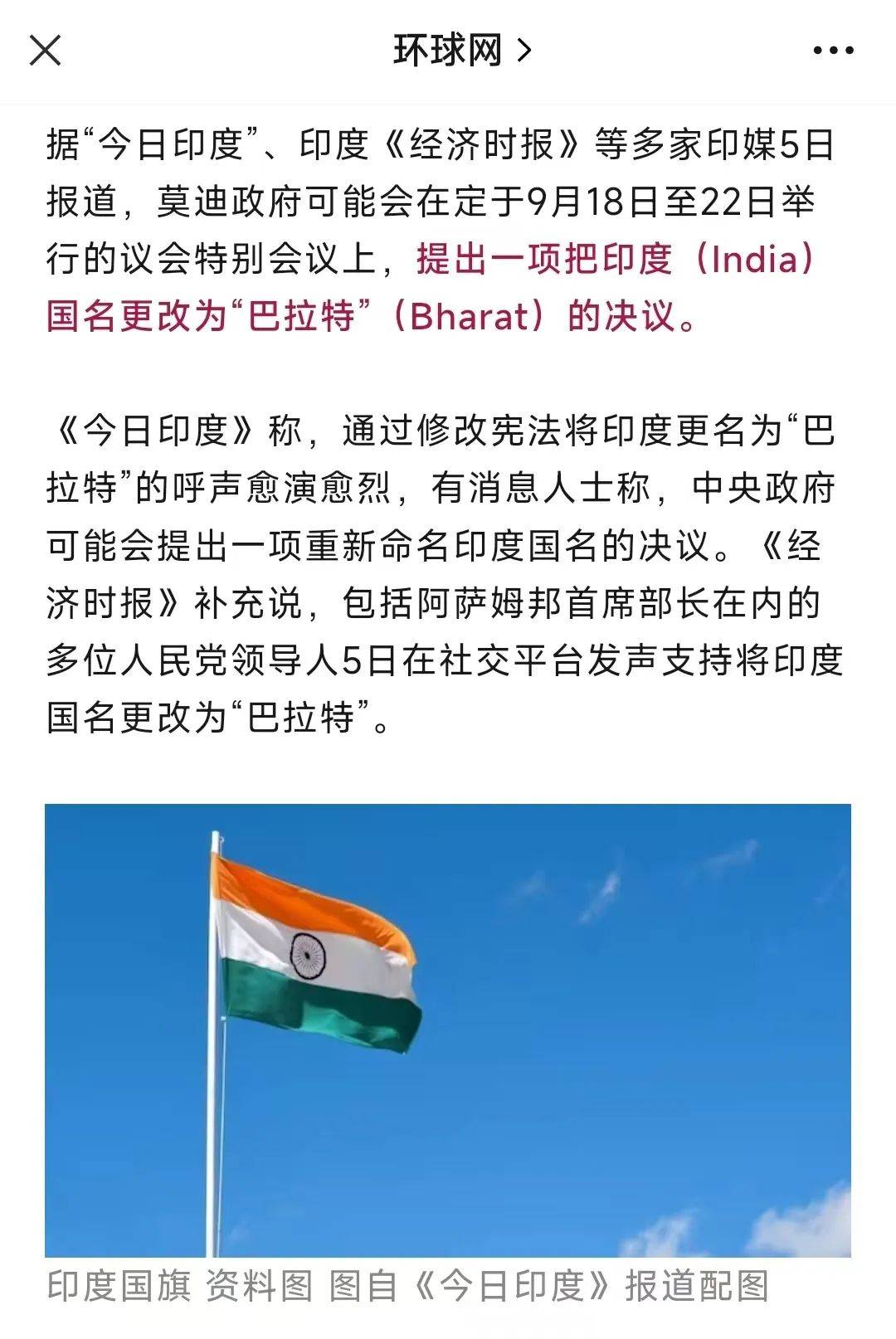 昨天晚上,大伊万在刷微博的时候,看到了一则相当炸裂的消息。根据环球网援引多家印度媒体的报道,印度总理莫迪老仙这几天正在寻摸着,要给印度改名儿了。据称,莫迪老仙准备在9月18日到22日举行的印度议会特别会议上提出一项动议,动议的主要内容是将印度的国名从“India”更名为“Bharat”(“巴拉特”)。