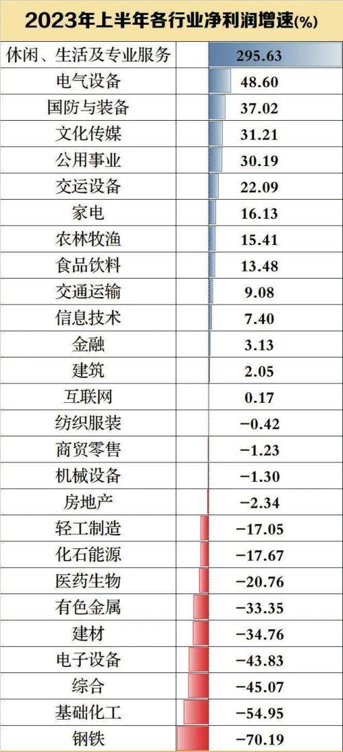 从行业来看,据东财一级行业数据显示,A股上半年休闲、生活及专业服务行业归母净利润增幅最大,达到295.63%。此外,电气设备、国防与装备、文化传媒、公共事业等行业排名靠前。钢铁、基础化工、电子设备、建材等行业排名靠后,其中,钢铁行业归母净利润同比增长率为-70.19%。