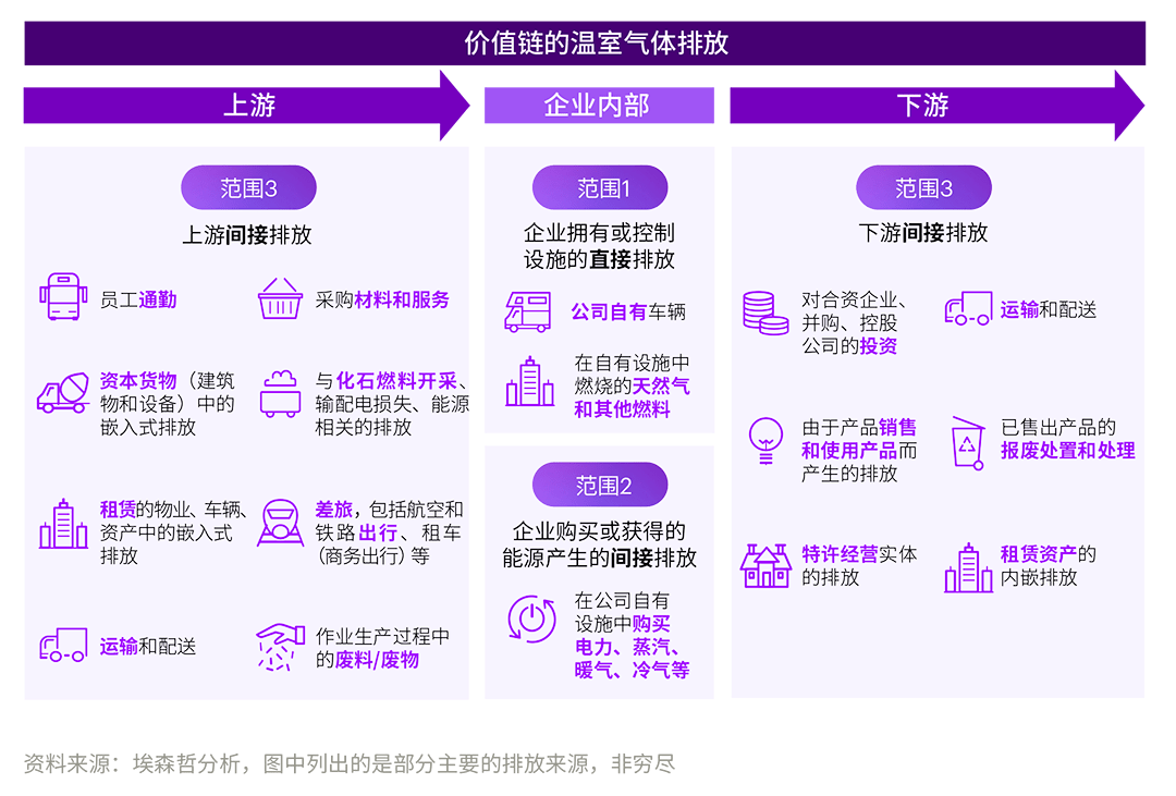 供应链运营通常占这些排放的绝大多数。企业必须为了达成净零目标而努力,不能满足于仅仅停止产生负面影响的活动,而是需要在企业供应链的各个节点创造价值,在其内部运营以及供应链的上游和下游减少范围1、2和3的碳排放。