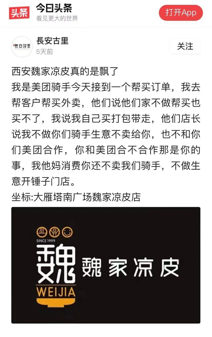 回到我们这次的关注点:魏家凉皮为何要宣战美团外卖?