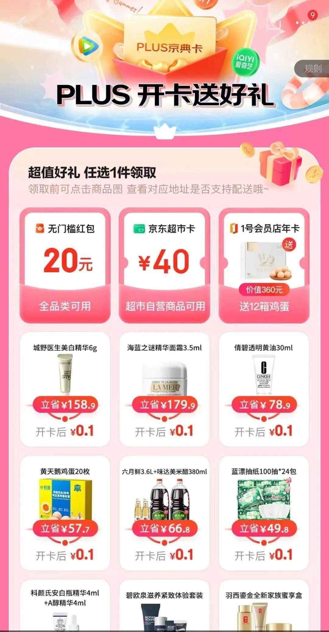 在页面内开通可赠 40 元京东超市卡 / 1 号店会员年卡(可领 12 箱可生食鸡蛋)等权益(任选其一),折合 Plus 会员年卡到手价为 59 元起。