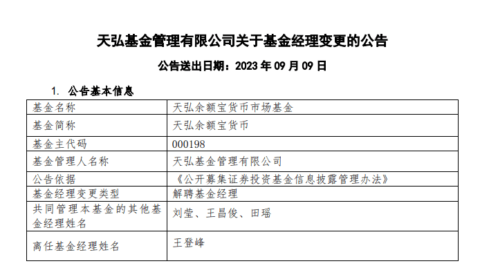 据天弘基金公告,天弘余额宝基金经理王登峰因个人原因于9月9日离任,也不再转任该公司其他工作岗位。天弘余额宝由刘莹、王昌俊、田瑶三名基金经理继续管理。